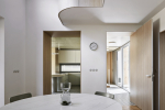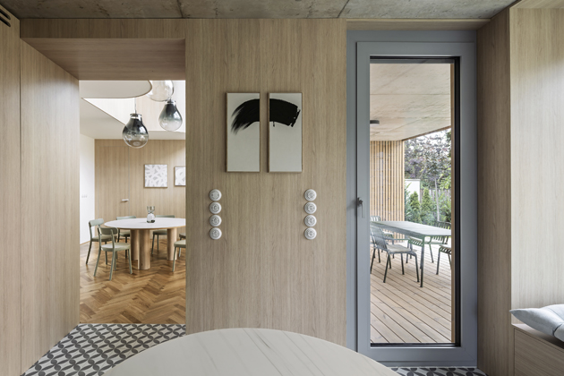 Kuchyň je orientovaná do klidné zahrady, navazuje na venkovní terasu a s jídelnou je spojena průchodem. Se zahradou je propojená sedacím oknem s úložnou lavicí, která maximálně rozvíjí její potenciál a vytváří příjemné místo k odpočinku. Kuchyň materiálově reflektuje odhalený strop – betonová podnož (polo)ostrůvku byla odlévána na míru. Pracovní deska z Corianu v mramorovém dekoru umožňuje dokonalé provedení beze spár i u náročného tvaru do písmene U. Skříňky střídají hladké plochy a jemné drážkování, jež ladí s obloučkovým nástěnným obkladem Orac, který se line po zdech napříč celým návrhem. Šedá retro mozaika Valsecchia Gemini Grey vytváří kontrast k růžovým barovým židlím Visu (Muuto), které prostoru propůjčují hravost, stejně jako designový lustr Artemide.