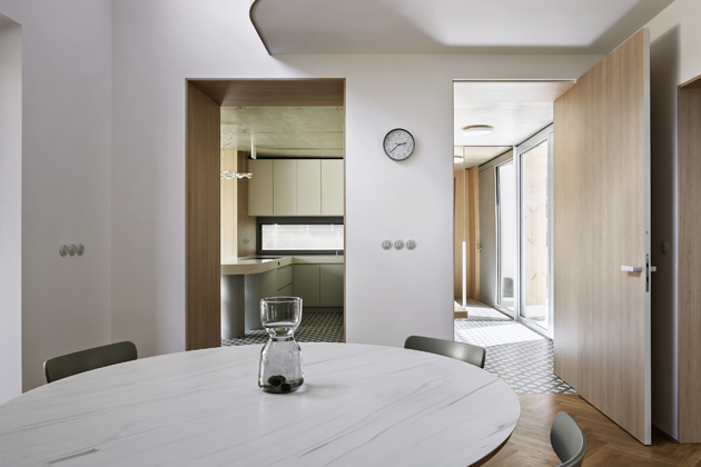 Kuchyň obývá samostatný prostor. Navázali jste tak na tradiční prvorepublikový model, kdy je kuchyň oddělená od společenské místnosti?
