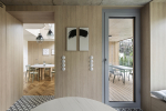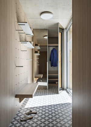 Vstupní zádveří jsme rozšířili o šatnou ukrytou za zrcadlovými dveřmi. Díky tomu zůstává vstup do domu stále přehledný a snadno udržovatelný. Odkládací prostor pro hosty tvoří variabilní stěna s kolíky v jemném pastelově zeleném tónu, která se pružně přizpůsobí proměnlivému počtu návštěv. Stěny využívající obložení dubovými panely jsou praktickým řešením, které eliminuje nutnost časté renovace výmalby v namáhaném prostoru.