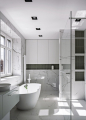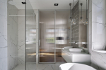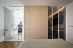 V patře se nachází ložnice, do níž jsme integrovali koupelnu i šatnu zároveň. Dispozice patra vyžadovala úpravu, která eliminovala zbytečné chodby. Koupelna díky tomu disponuje nadstandardně velikým sprchovým koutem pro dva a podařilo se sem umístit i vanu a dvě umyvadla. Plastická oválná mozaika Aquarelle mint grey v šedozelené barvě a ornamentální skla Flutes dotvářejí hru světla v interiéru.