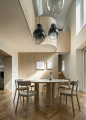 Ze zádveří pokračuje jídelna s převýšeným stropem a galerií, která se stala srdcem domu. Vybavili jsme ji kulatým, na míru zhotoveným stolem s masivním trojnožím a doplnili židlemi Zitta od TON. Stůl je rozměrově velkorysý a může u něj stolovat celkem až osm hostů a stejně jako veškerý nábytek na míru pochází z dílny Le Bon. Nad jídelní plochou se vznáší elegantní trojice kouřových lustrů Tim od české značky Bomma a dodává prostoru téměř sochařský charakter.