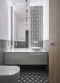 Interiér prvorepublikové vily pracuje s průhledy mezi jednotlivými místnostmi a s vědomou kompozicí materiálů. Důležitým motivem jsou kontrasty. Napětí vzniká také v měřítku použitých prvků – drobné mozaiky na podlaze a stěnách vstupují do dialogu s velkoformátovými obklady, do nichž jsou integrovány skryté dveře. Klíčovým momentem realizace je právě vyvážení těchto vrstev – materiálu, proporce a detailu – tak, aby nový zásah přirozeně doplnil charakter domu a zároveň mu dal současnou vrstvu.