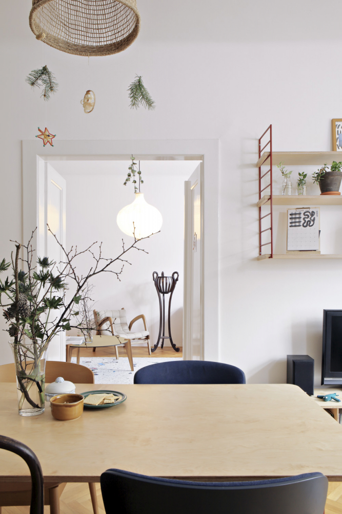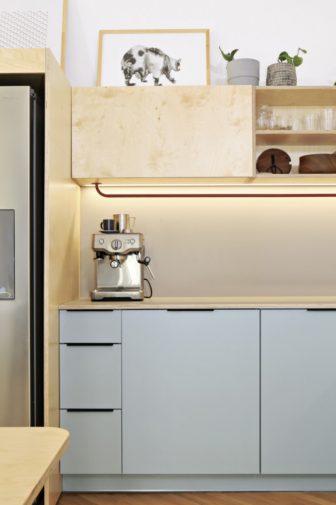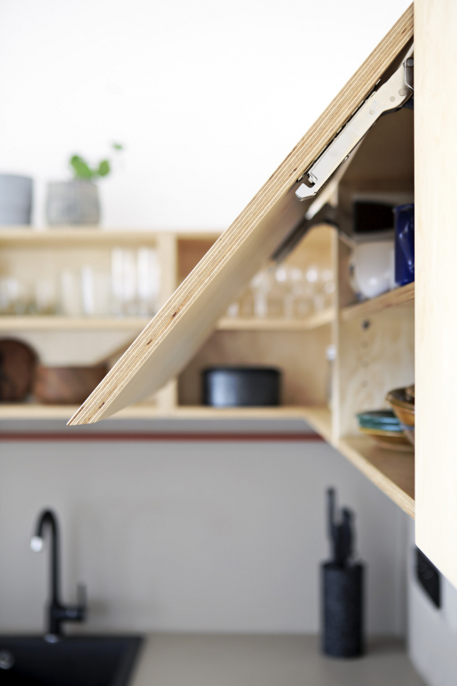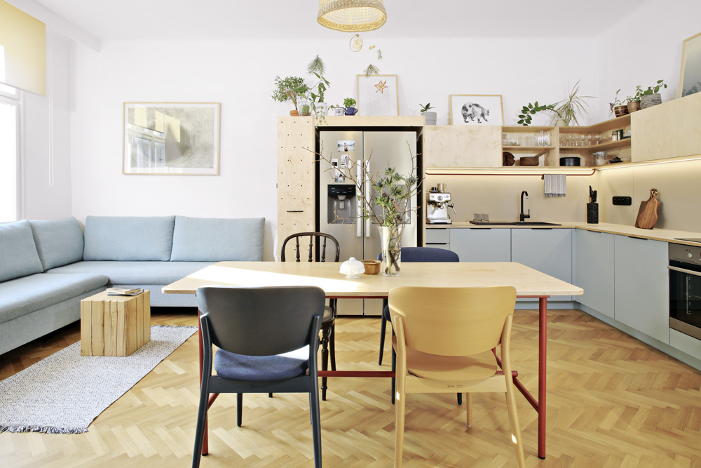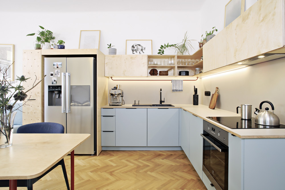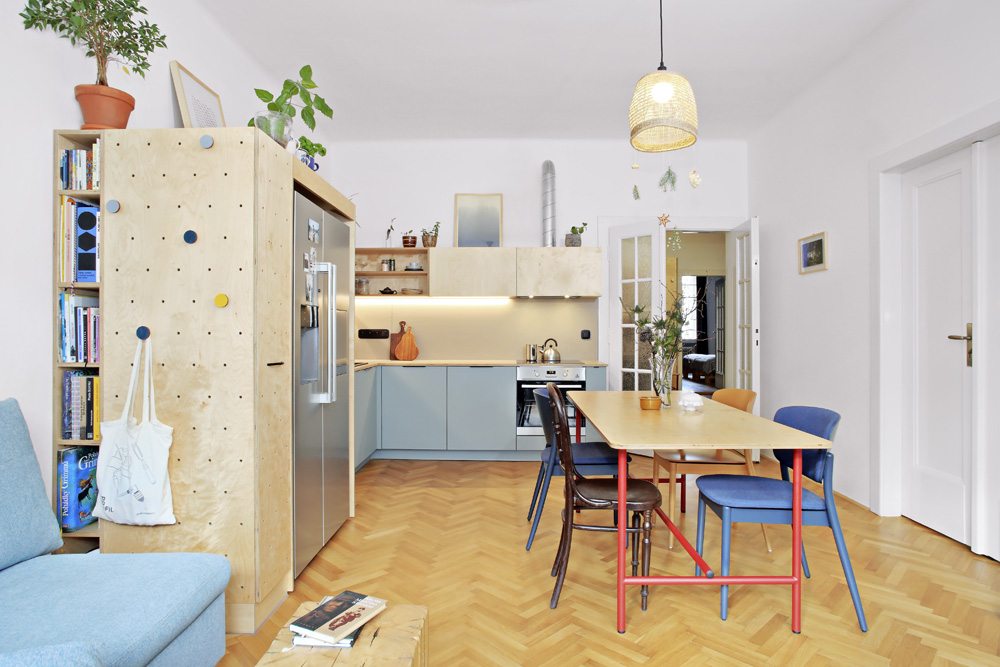 Kuchyňská sestava je vyrobena na zakázku a kombinuje překližku s modrým laminem, jež je z praktického hlediska použité na spodní skříňky. Praktický je překližkový modul, jehož součástí je potravinová skříň a knihovna a také je do něj integrována americká chladnička. Jídelní stůl na zakázku kombinuje dřevo a červeně lakovaný kov. Odpočinkovou část tvoří modrá sedačka Game od značky Jech, kterou mají sestry ze studia Schwestern velmi oblíbenou a použily ji už v nejedné realizaci. Celý byt je prý taková skládačka, kterou si Iveta dělala pro radost. Mohla popustit uzdu své fantazii, protože tentokrát byla svým klientem ona.