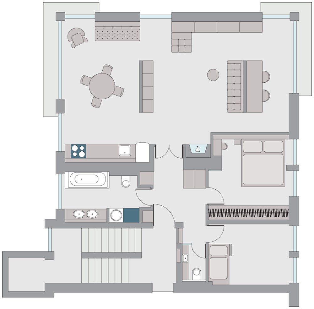 Vzhledem k umístění bytu na hraně Kavčích Hor otevřeli především hlavní prostor velkolepému výhledu na Vyšehrad, Pražský hrad, Karlův most a další…