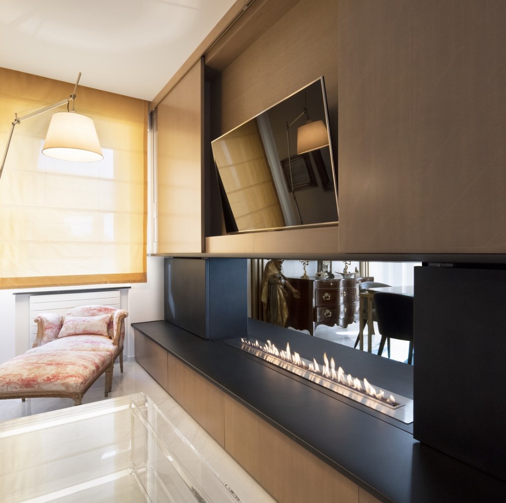 Na dělicí stěně v obývacím pokoji jsou patrné barvy starožitného nábytku i rámu zrcadla. Biokrb vložený ve zdi slouží jako propojení společenské části a salonku. Během zimních večerů tak spolu mohou přes vzniklý výklenek komunikovat hosté, kteří sedí na obou stranách ohně.