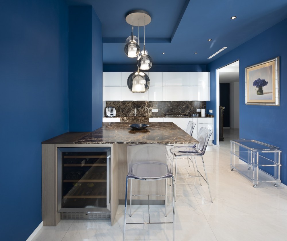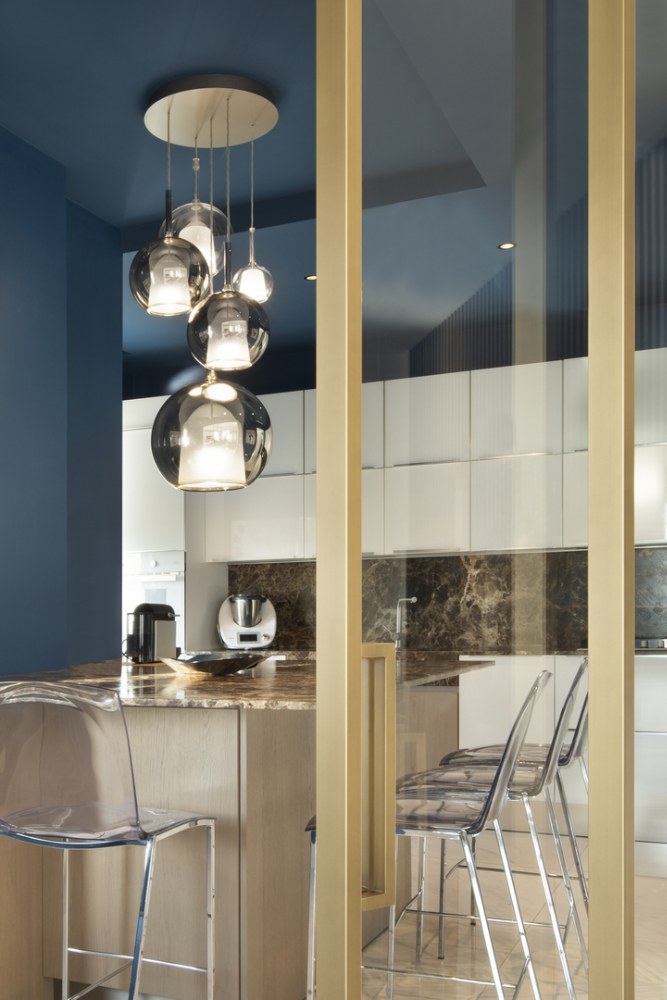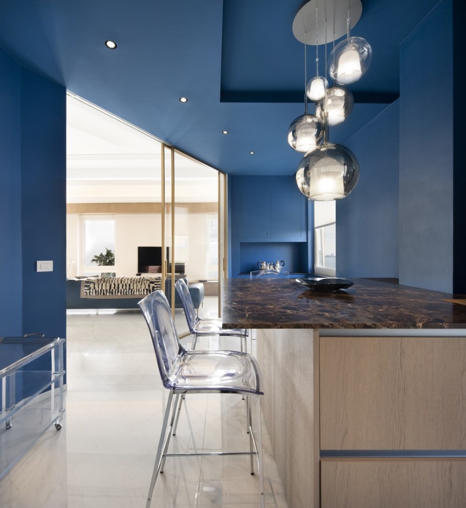 Kuchyň je oddělena od obývacího pokoje posuvnými skleněnými dveřmi. Svou modrou barvou kontrastuje se světlými tóny podlahy a kuchyňského nábytku. Deska dřeveného kuchyňského ostrůvku je z mramoru, který je dominantním prvkem celého interiéru.