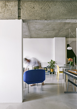 Alanův byt se nachází v pátém poschodí z šesti, což v něm společně s příhodnou východozápadní orientací oken vytváří jedinečné světelné podmínky. Jako profesionál si jejich přednosti uvědomil hned v prvopočátcích a rozhodl se tomu přizpůsobit koncepci celé rekonstrukce. Příčky původně třípokojového bytu s rozlohou 70 metrů čtverečných, které fungovaly jako spolehlivé bariéry pro tok přirozeného světla, byly obětovány ve prospěch prostorné otevřené dispozice. Zůstaly jen základní nosné prvky obnažené na dřeň. Cesta světla z východu na západ byla volná.