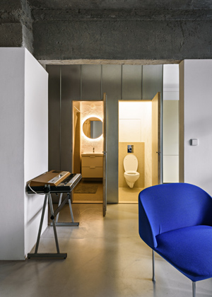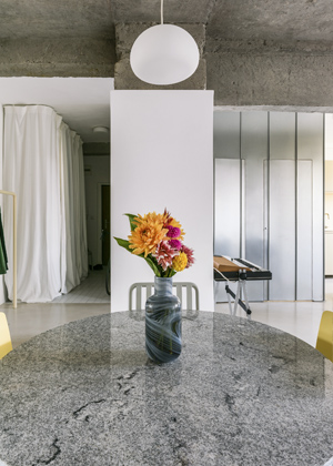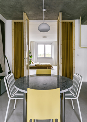 Ve společenské části bytu s jídelnou byly hojně využity zbytkové materiály recyklované z jiných projektů, které tu našly nový smysl, ať už v podobě rastrovaného pásu z bílých čtvercových obkladaček, police z betonových tvárnic a modrého průhledného skla, nebo jídelního stolu s deskou z leštěné žuly. Atypicky vyrobeným kouskům nábytku sekunduje minimální množství solitérního nábytku – subtilní kousky nezatěžující prostor zbytečnou hmotou, pečlivě zvolené v materiálovém zpracování i barevném pojetí, které oživuje byt IO máslově žlutými a ultramarínovými akcenty.