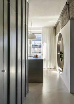 Jak podotýká Alan Prekop, „největší výzvou návrhu bylo vytvořit prostor exponovaný do té míry, aby každý pokoj nedefinovaly zdi, ale prostor samotný a v něm použité materiály“. Potřebu intimity tak architekt spojil s textilem – koberci, čalouněným nábytkem a bohatými závěsy, které mohou zakrývat výhled velkými okny jak do ložnice, tak z druhé strany do celého bytu. Potřebu světla podpořil čirým sklem a prvky z nerezavějící oceli, která se uplatnila i na velké ploše kuchyňského ostrůvku, netypicky na čele postele nebo na vnitřním obvodu kruhového průhledu. Další plochy odrážející světlo byly použity na parapetech a v plátu galvanizovaného kovu ukryly dveře do malé koupelny a samostatné toalety. Materiálem spojujícím realizaci s historií místa a jeho kořeny se stal surový beton odhalený na části stropů a spojený s přiznanými technicistními prvky nezakrytých trubek a kabelů.