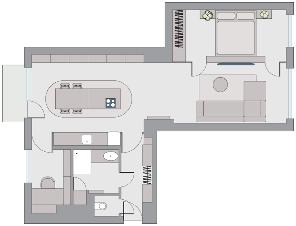 Na počátku majitel vyjádřil poměrně jasnou představu, společně se pak ale rozhodli pro poněkud dramatičtější úpravu. Na malém jevišti se pokusili odehrát velké divadlo. Zásadní bylo otevřít hlavní místnost, a ukázat tak největší prostor bytu v plné kráse. Malé pokoje vyměnili za otevřený prostor. Hlavní obytnou místnost (obývací pokoj s kuchyní a jídelnou) rozprostřeli přes celou hloubku domu. Zvětšili koupelnu a naopak minimalizovali pracovnu a ložnici.