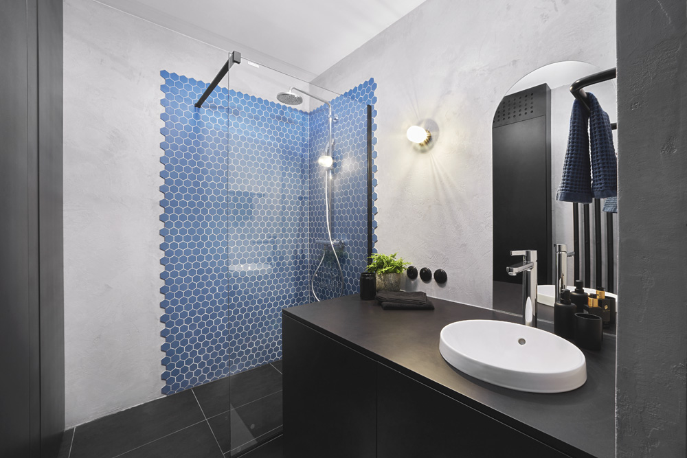 Přestože tento interiér nebyl pro architekty láskou na první pohled, lze tu zachytit láskyplnost a svěžest. Modrý akcent tak trochu prozrazuje působiště muže. Modrým tónem a tvarem obkládaček však může také připomínat drobné květy pomněnek, které v květnu zaplavily pěstěné trávníky, nešlechtěné louky i planě vyhlížející meze.