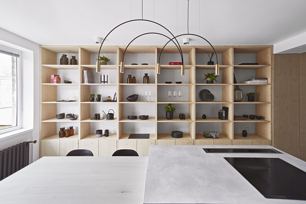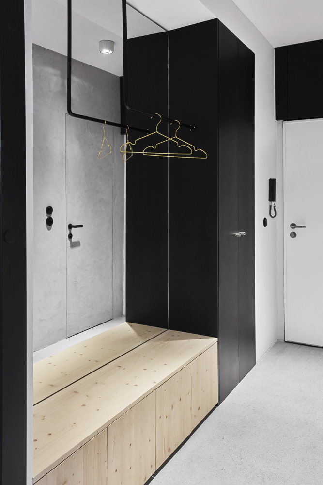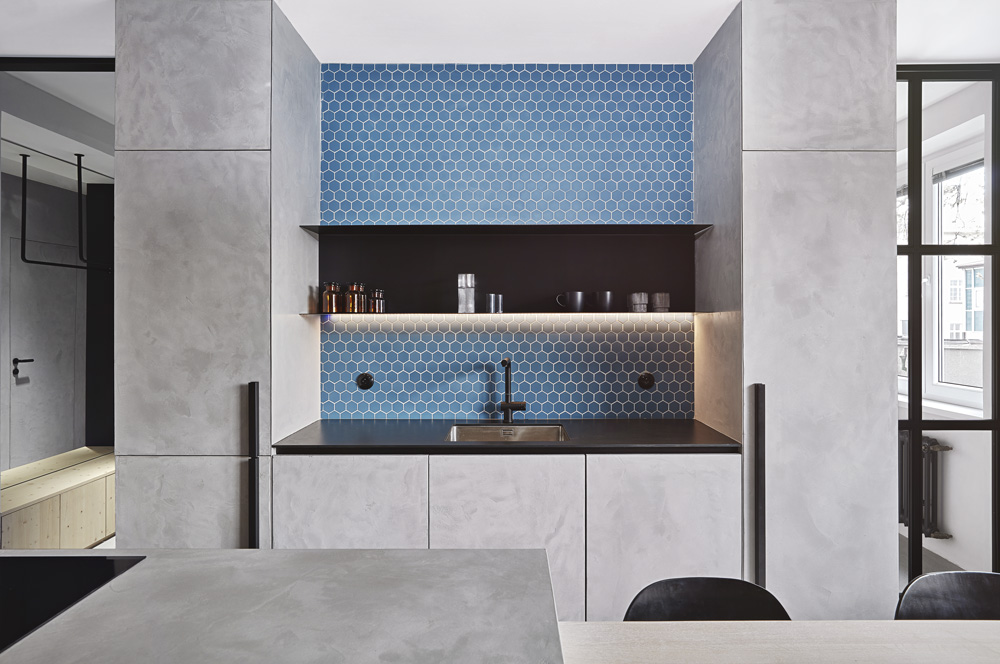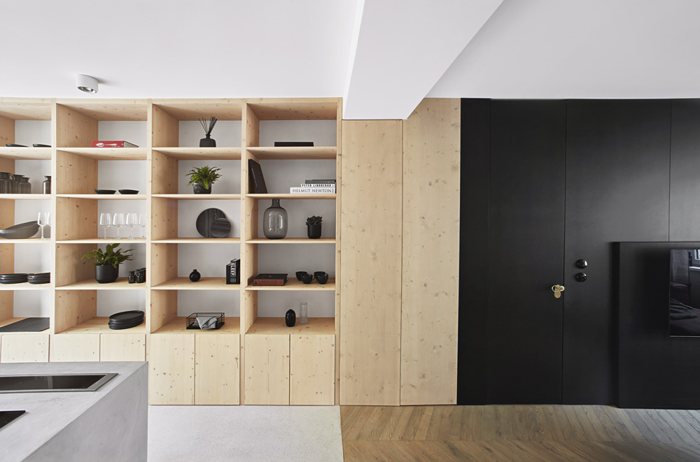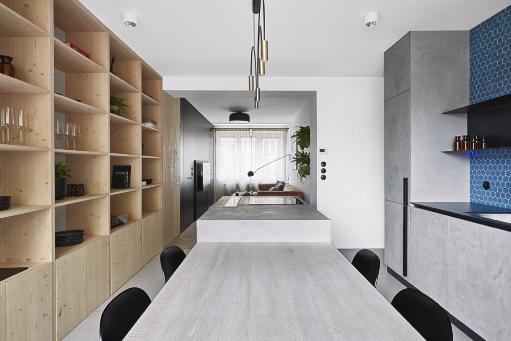 Ve výsledku lze tedy hovořit o dost specifickém bytě 3+kk. „WC a koupelna jsou v nově vystavěném bloku kolem šachty. Na něj přiléhá kuchyň. Blok i kuchyň jsou ošetřeny stěrkou, aby splynuly v jeden celek. Ten jsme se snažili co nejméně narušit. Použili jsme proto skryté zárubně místo klasických a na dveře aplikovali stěrku stejně jako na sousedící stěny,“ vysvětluje architektka a dál objasňuje specifika rekonstrukce.