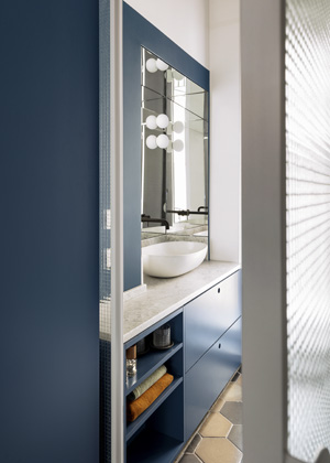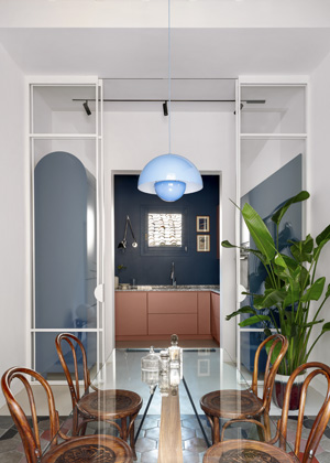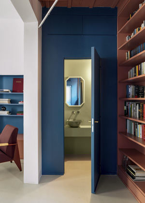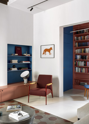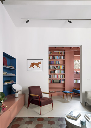 V prostorové rovině studio Punto Zero pracovalo se společenskou a klidovou částí bytu, kterou odrazilo v použité barevné paletě. Z obývacího pokoje a přiléhající kuchyně vytvořilo otevřený, expresivní prostor s výrazným barevnými prvky v odstínech modré, starorůžové a bordó. V intimnější části s ložnicí a koupelnami ubralo na barvách a dopřálo prostoru obrácenému do vnitřního dvora více klidu. Stále však tak, aby obě části bytu zůstaly ve vizuálním a prostorovém spojení.