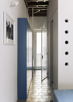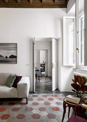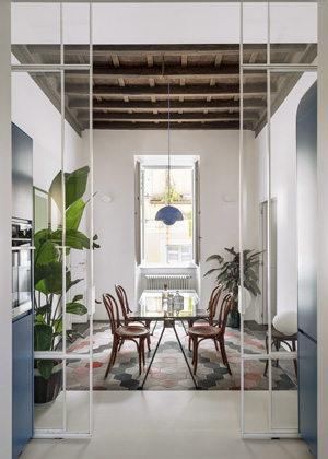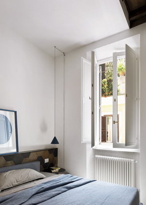 Rekonstruovaný byt se nachází v domě ze 17. století, v prastaré čtvrti Rione Monti, která se rozkládá v samotném centru Říma, v úzkém sevření mezi Koloseem, Forem Romanem a Fontanou di Trevi. Díky poloze ve stínu proslulých památek zde plyne čas pomaleji než v místech zasažených obvyklým turistickým cvrkotem. Pokud zajdete na drink do některého ze stylových barů a tratorií, pravděpodobně bude vaším sousedem u stolu některý z místních obyvatel, který si přišel prostě jen posedět do charismatické čtvrti s obrovskou atmosférou a hipsterskou pověstí.