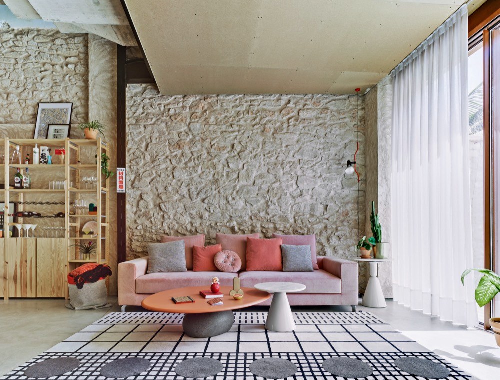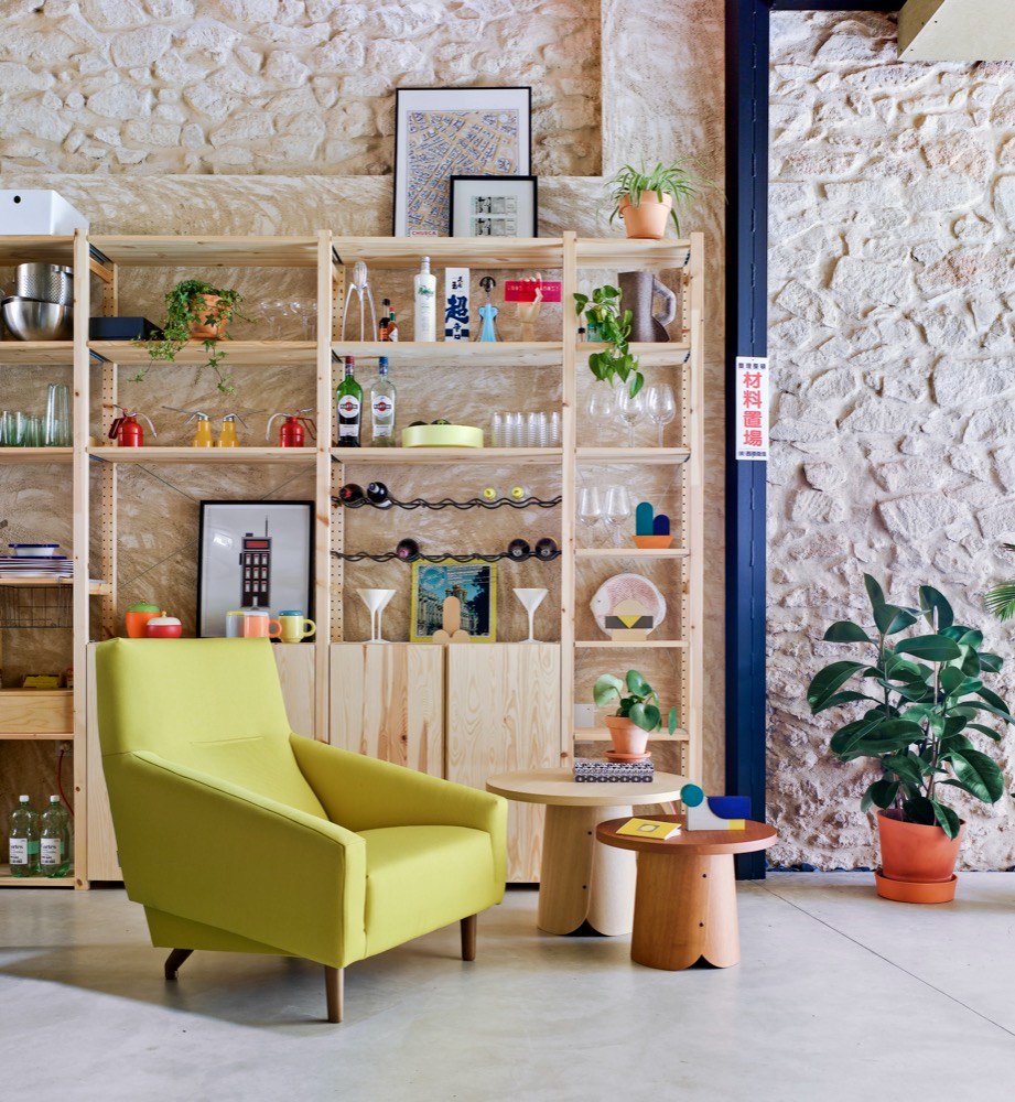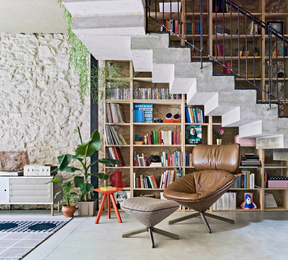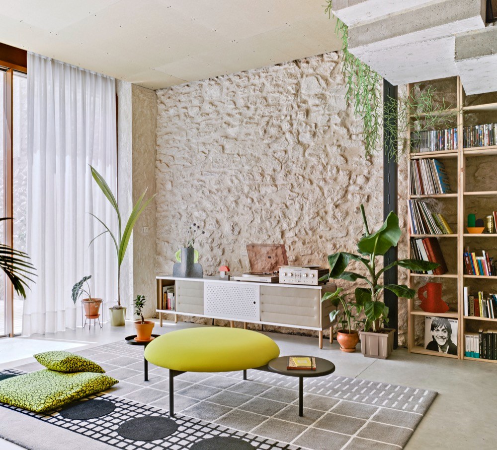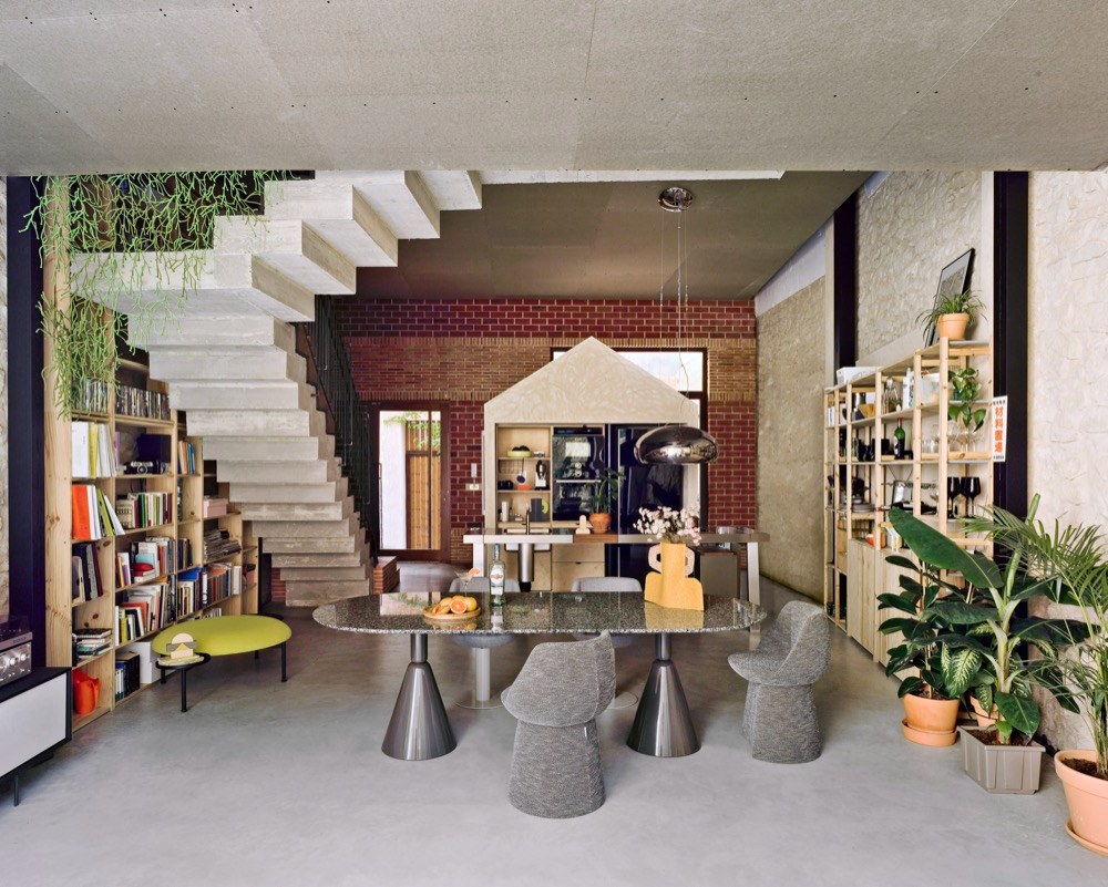 Hned pohled do kuchyně naznačuje, jakými pravidly se rozpustilá hra na „dům v domě“ řídí. Domečky jsme jako děti milovali snad všichni, a pokud někdo najde odvahu přenést kus dětství do dospělosti, naše nostalgické já mu rádo zatleská. Interiér nepůsobí draze, ale nápaditě, obrací se zády k přepychu a okázalosti, sází spíš na upřímnost a luxus nachází ve velkorysém prostoru. Hodně mu v tom pomáhají autentické materiály, jako je dřevo, beton, cihly nebo kámen, které mají vztah k místu a poskytují interiéru rovnováhu a osobitost. Ve vykuchaném domě navrhlo architektonické studio La Errería samostatné jednotky vybudované z dřevotřískových OSB desek, plovoucí v prostoru a pospojované bytelným betonovým schodištěm. To vychází právě z přízemního společenského prostoru s otevřenou kuchyní a přístupem na dvě venkovní terasy z obou stran domu. Je tu všechno, co by mohli obyvatelé neobvyklého domu při společném trávení času potřebovat. Plně vybavená kuchyň, velký jídelní stůl s pohodlnými židlemi, koutek na čtení nebo poslouchání desek, měkoučká sedačka na povalování. Nábytek od španělské značky Sancal sem vnáší nejen barevné akcenty, ale i hravost a nekonvenčnost. Na první dojem může prostor působit přeplněně a chaoticky, ale jisté je, že užívat si tu bude snadné.