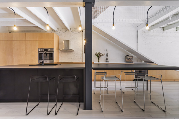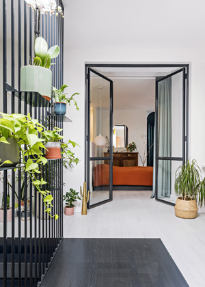 Z této logiky vzešlo pořízení celého dvojdomku i jeho následné architektonické řešení. Florence Charronová se jej zhostila poměrně radikálně ve prospěch prostoru, volného pohybu v něm a přísunu přirozeného světla. Celý interiér byl dokonale vypreparován tak, aby v něm zůstaly obvodové cihlové zdi a původní trámové stropy podepřené ocelovými sloupy.