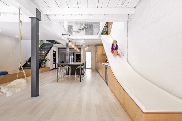 V zájmu otevřeného, variabilního prostoru byl interiér vybaven minimem nábytku, což odráží fakt, že majitelé dávají přednost společnému trávení volného času a zážitkům před hromaděním hmotných statků. Veškeré úložné prostory jsou soustředěny do atypických řešení, jako je přízemní podesta schodiště, kuchyň nebo zázemí za závěsy v prvním patře. Výjimku tvoří několik solitérů, kteří majitelé posbírali na svých cestách. V centru pozornosti se tak ocitají originální, hravé a dodejme i prostorově náročné prvky, jako je obří skluzavka, domácí houpačky nebo horolezecká stěna, které dodávají koloběhu života v domě svéráznou dynamiku.