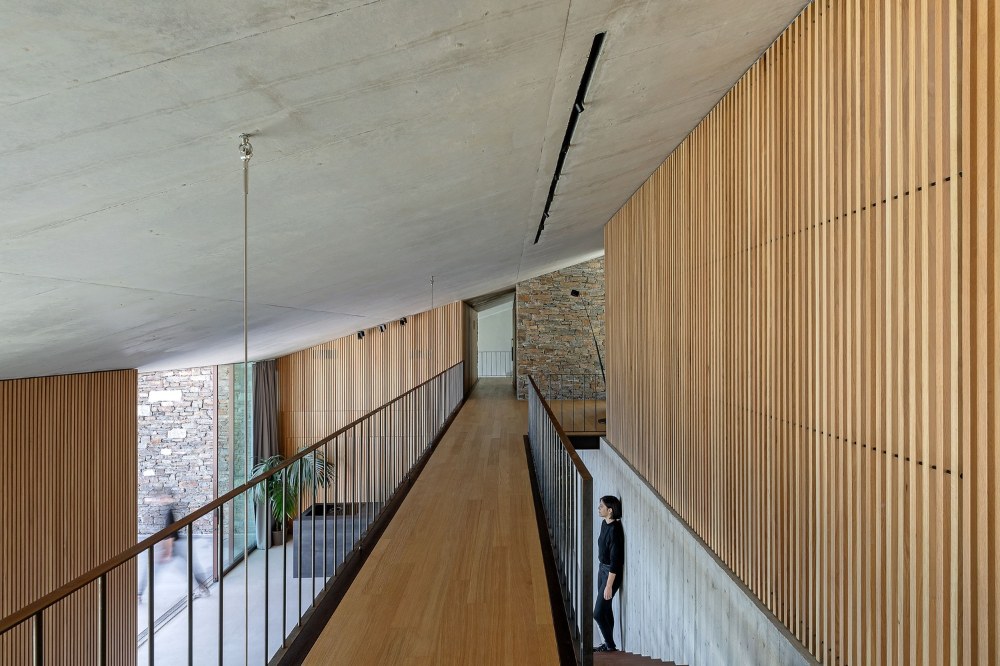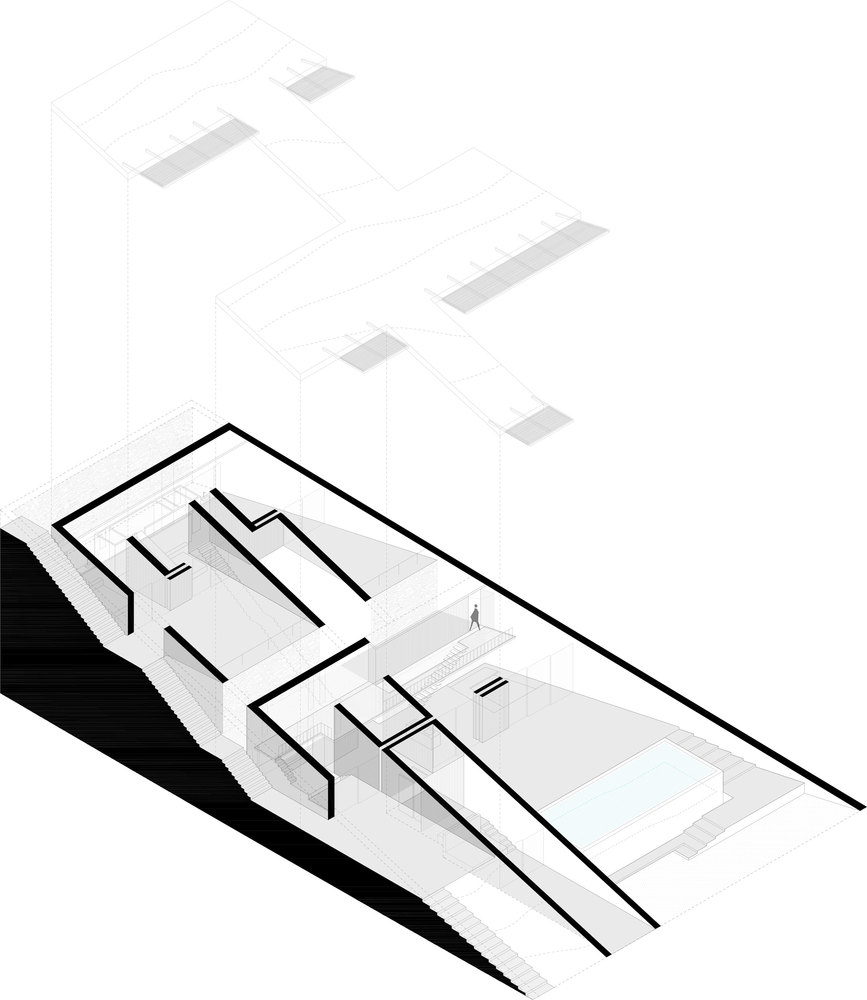 Na svahu byla vytvořena trojrozměrná „šachovnice“ z monolitických dílů a otvorů, které vymezují obytné části. Podélné části z kamene tvoří kontury a hranici mezi vnitřními a vnějšími prostory.