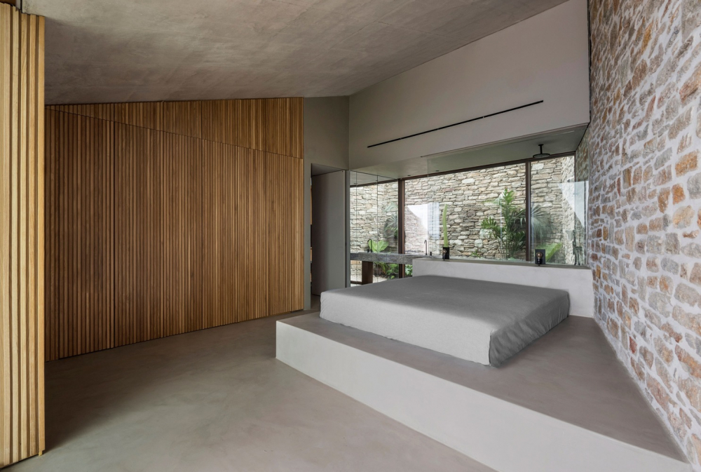340m2 velký dům je rozdělený do tří úrovní: ložnice, obývací pokoj a pokoje pro hosty. První dva jsou propojené, část pro hosty je oddělená.