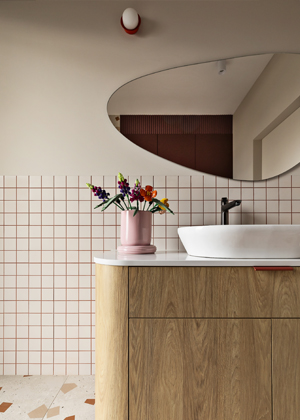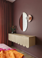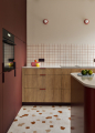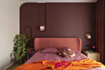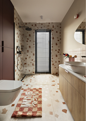 Zvoleného konceptu barev, dekorů a grafické vřelosti se autorky přidržely i v případě koupelny. Prim tentokrát hrají dlaždice s hrubým teracem, které kromě podlahy obsadily také stěny rámující prostorný sprchový kout typu walk-in. Stejně laděné jsou i truhlářské prvky – výraznou součástí je vysoká vínová skříň vytažená až ke stropu a také oblý koupelnový stolek. Obliny pak autorky promítly také do návrhu ložnice – drobný nábytek tak zvládl umocnit klidnou a přívětivou atmosféru, stejně jako čelo postele a dekorativní stěna se zaoblenými nikami a měkkým osvětlením v pozadí. Odstíny vínové, růžové a oranžové dodávají místnosti pocit tepla a intimity.