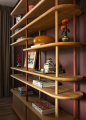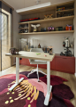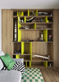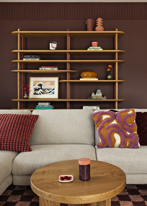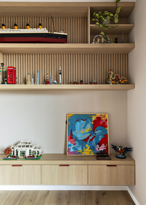 Hlavní slovo si bere masivní policová sestava se vzpěrami z kulatiny, která poskytuje důstojné zázemí pro modely z kostek, knihy a fotoalba z cestovatelských výprav. Dalším dotykem hravosti jsou i barevné polštáře s haptickým povrchem na barevně neutrální pohovce či koberce s šachovnicovým dekorem a vysokým vlasem. Obojí přitom místnosti dodává silný grafický akcent.
