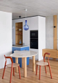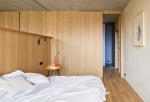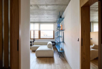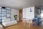 Panelový byt vysoko nad Prahou se díky radikálnímu projektu proměnil v otevřený elegantní prostor inspirovaný rozlehlým obzorem, jachtingem, světlem i neustálým pohybem velkoměsta. Autorky návrhu pracují s kombinací surového betonu, dřeva a odstínů modré, která působí kontrastně, a zároveň vytváří uklidňující atmosféru. Výsledkem je minimalistické útočiště, kde se městský ruch vzdaluje a ustupuje do pozadí příjemného ticha.