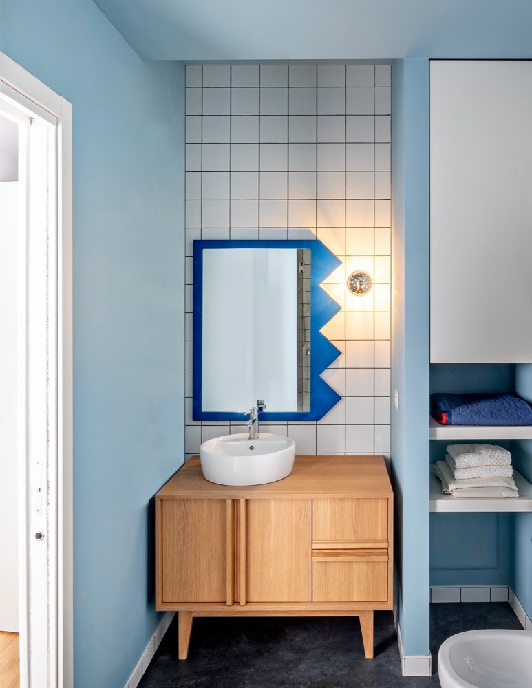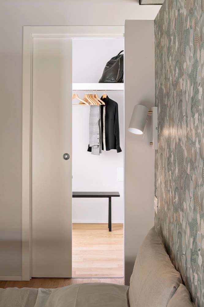 Oblá příčka odděluje malou kuchyň s jídelnou, pravoúhlá příčka definuje přechod z denní zóny do ložnice. Oba byty mají užitnou plochu 58 m2 a vybaveny jsou střídmě, ale pečlivě vybraným mobiliářem. Kuchyňské sestavy a vestavěný úložný prostor byly vyrobeny na míru z dubového dřeva v dílně Miduny Furniture, sesterské společnosti architektonického studia, které je autorem celé realizace. Solitérní nábytek má převážně neutrální odstíny, výraznějšími prvky jsou zde jen doplňky v podobě pestrobarevných textilií a obrazů. Kvalitní řemeslná práce, minimalistické pojetí dispozice a kontrast nového a starého vdechly historickému paláci nový život důstojným způsobem.