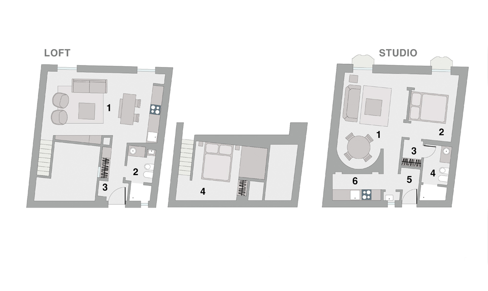Byty se shodným půdorysem se nacházejí v podlažích přímo nad sebou, vzhledem k rozdílné světlé výšce přesto vyžadovaly striktně individuální architektonická řešení. Loft Piano Nobile ve druhém nadzemním podlaží využívá vertikální aspekt s výškou stropu 4,4 metru. Ve třetím nadzemním podlaží se nachází byt se zaoblenou stěnou, projekt zvaný Round Wall Studio, v němž architekti pracovali s horizontálním směrem a jednotlivé místnosti oddělili sníženými příčkami. Před rekonstrukcí byly oba interiéry v nevyhovujícím technickém stavu a jejich dispozice zahrnovala množství malých místností, některé dokonce bez přístupu denního světla. Původní architektonické prvky v podobě zdobených dřevěných průvlaků a trámového stropu ukrýval štuk a odhaleny byly až na začátku demoličních prací.