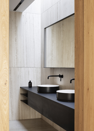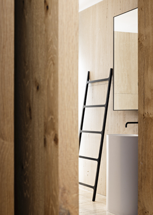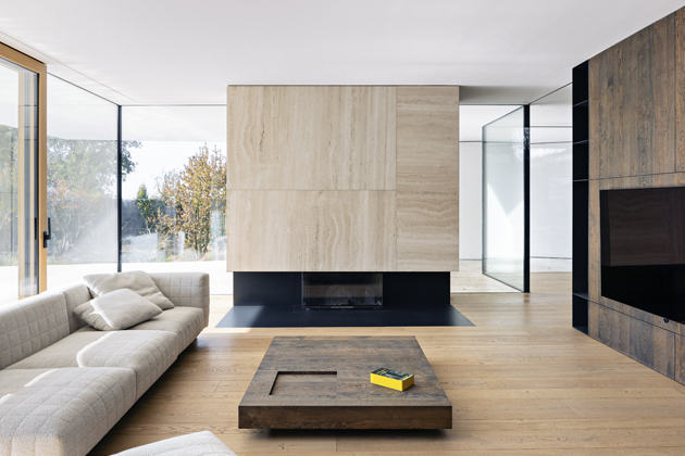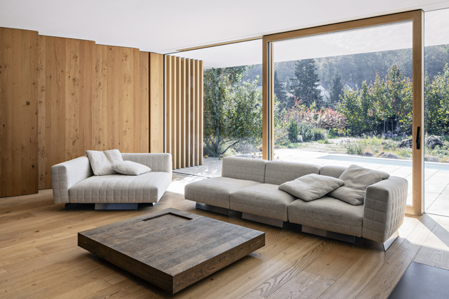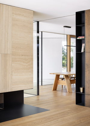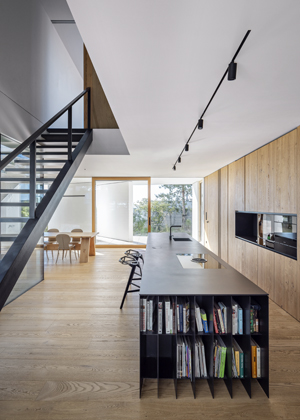 Stejně tak ložnice po stranách domu díky šikmým stěnám zaručují soukromí při nerušeném výhledu do zahrady,“ popisuje autorská zpráva dispoziční řešení s ohledem na harmonické okolí. Základ interiéru tvoří na podlahách, nábytku i obkladech stěn dubové dřevo, které je místy kombinováno s travertinem a černě lakovaným plechem. Minimum volně stojícího nábytku, zvolené materiály a neutrální barevnost umožňují vyniknout samotné stavbě a jejímu přirozenému propojení s okolní přírodou.