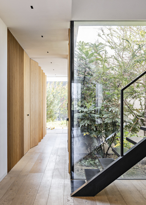 Stavbu z větší části lemují velkoformátová okna propouštějící do interiéru dostatek denního světla i příjemné množství vzrostlé zeleně, která se tak stává zásadní součástí domova: „Hluboká dispozice domu využívá k prosvětlení centrální atrium s divokou zahradou evokující džungli, kolem něhož jsou uspořádány hlavní obytné funkce.