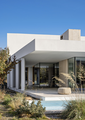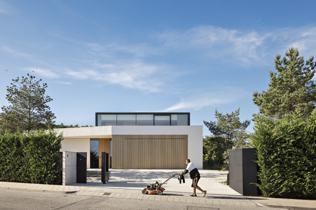 V letních měsících toto řešení plně nahrazuje běžně využívané druhy ochrany před osluněním, zatímco v zimě zase umožňuje slunečním paprskům prohřívat interiér. Vzniklé terasy jsou vítaným rozšířením obytného prostoru – ve východní části jako ideální místo pro ranní kávu a v té západní a jižní jako hlavní terasa s bazénem. Horizontální kompozici domu doplňuje hmota pavilonu na střeše s wellness prostory zahrnujícími saunu a velkorysé posezení s výhledem na vzdálený hrad Pajštún.