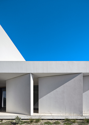 Šikmé stěny po obvodu zvenku dům uzavírají, zatímco zevnitř umožňují správným natočením nerušené výhledy do zahrady. Říkáme jim žábry.“ Tyto stěny ozvláštňují také estetiku stavby a po setmění tvoří za pomoci umělého osvětlení dynamickou hru světla a stínu. Stáčejí se pod přesahy střechy, které jsou navrženy s ohledem na orientaci domu tak, aby poskytly přirozené zastínění a vytvářely plynulý přechod mezi interiérem a exteriérem.