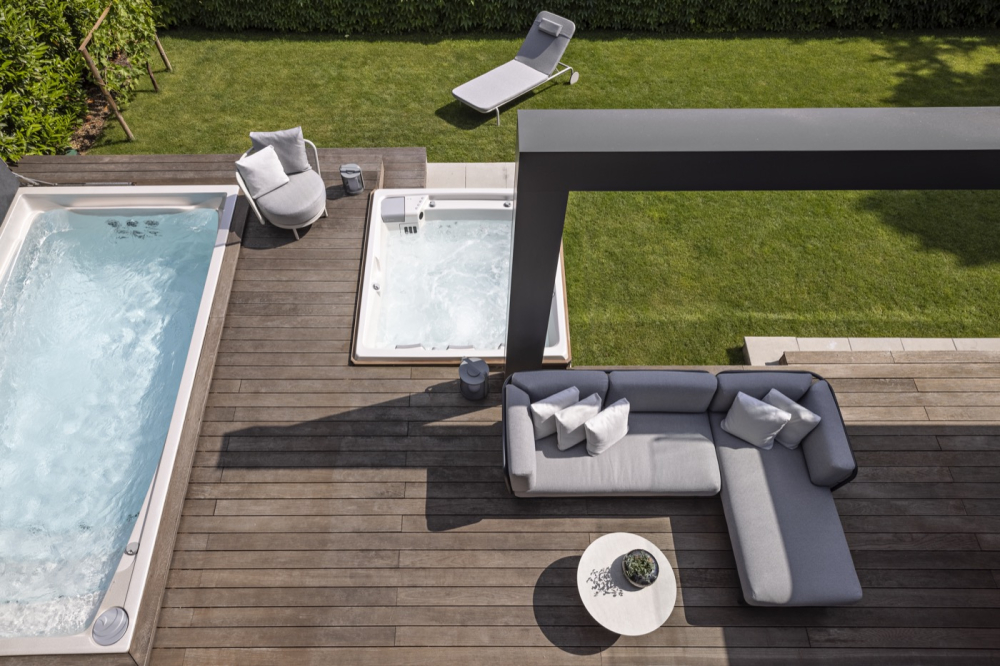 Terasa byla od počátku koncipována především tak, aby se sem vešel bazén s vířivkou. Cesta k jeho výběru ale nebyla jednoduchá: „Dvacet let jsme v předchozím domě měli nafukovací bazén, takže jsme si konečně chtěli dopřát nějaký pořádný. Kamarád mě od toho ale odrazoval. Varoval mě, že to je prý nejdražší díra v zahradě, protože náklady na provoz jsou enormní. Doporučil mi ale úspěšnou českou firmu USSPA, která prý nabízí alternativu k bazénu.“ Hned první návštěva v showroomu v Dobrouči rozhodla. „Jeli jsme se sice původně podívat na termální bazén swim spa, ale když jsme si vyzkoušeli rozdíly mezi aktivním odpočinkem ve swim spa a absolutním relaxem ve vířivce, bylo jasné, že budeme potřebovat oboje,“ usmívá se Daniela. „Jak se časem ukázalo, bylo to jedno z nejlepších rozhodnutí. Spáčka jsme od začátku hodně využívali, přestože naše zaměstnání byla spojená s cestováním a volný čas doma byl omezený. Zjistili jsme, že každou volnou chvíli trávíme v našich domácích lázních.“