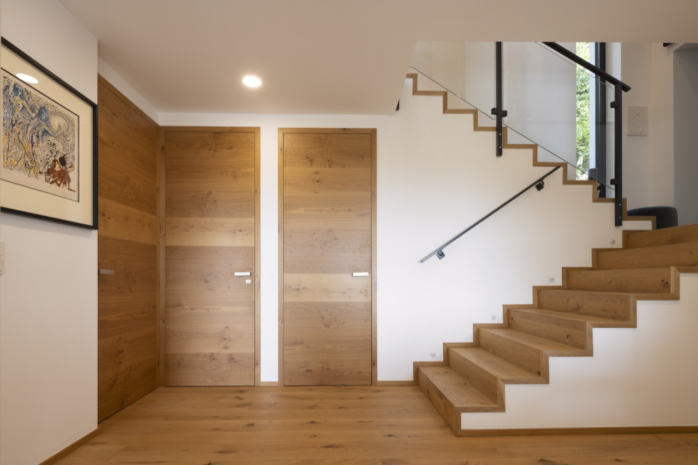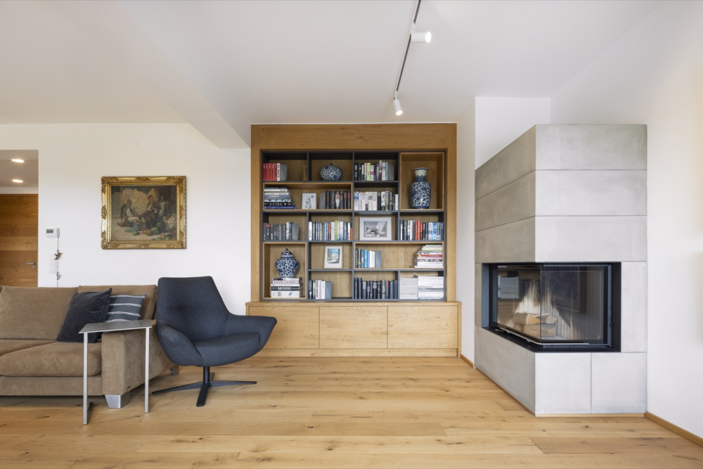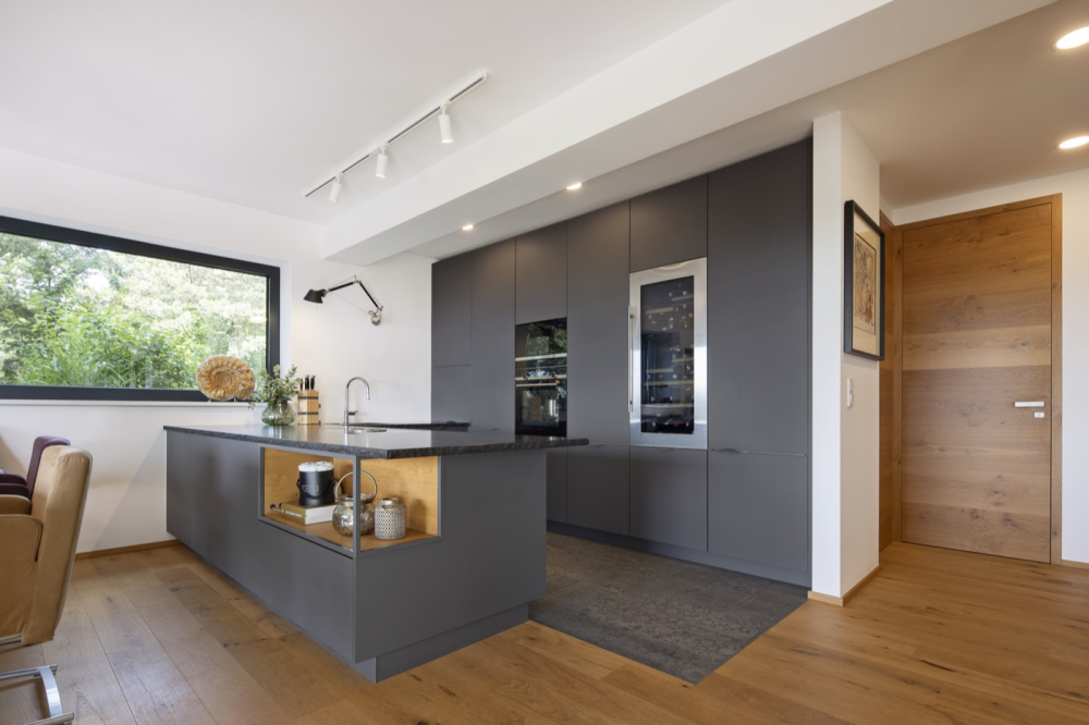 Rekonstrukce je v mnohém náročnější než novostavba. „Určitě pomohlo, že jsem z oboru. Hodily se mi doposud získané zkušenosti i kontakty. Nakonec jsme zvládli dům i zahradu přestavět za sedm měsíců,“ dodává spokojeně Josef. O tom, jak jejich nový domov bude vypadat, měli od začátku přesnou představu, což usnadnilo práci architektovi. „Naše představy nakonec posunul ještě dál. Už s projektem jsme byli velmi spojeni, ale to nejlepší mělo teprve přijít,“ chválí si Daniela. Nový dům ve Hagenbrunnu byl od začátku česko-rakouský projekt. Zatímco samotnou stavbu měla na starosti rakouská firma, kuchyň, vestavné skříně i nábytek jsou české. Interiérům dominuje příjemná medová barva dřeva, která kontrastuje s tmavými okenními rámy, vybranými doplňky a především kuchyní, která je laděná do černých odstínů. O zařizování domu se postarala Daniela, která léta pracovala v módním byznysu a design má v malíčku. Celková přestavba není nijak agresivní vůči okolí, nesnaží se popřít tvarosloví starého domu, jen ho dotahuje do elegantnějších linií. Oproti původnímu tvaru získal dům velká okna směrem do zahrady a prostornou terasu, kterou zastřešuje pergola. Ta je pochozí, a zároveň tak slouží jako balkon v prvním patře. Proměnou prošla i zahrada. Výrazným prvkem je dřevěná terasa, která se stupňovitě svažuje. Vzhledem k okolnímu terénu je odsud nádherný výhled na okolní lesy.
