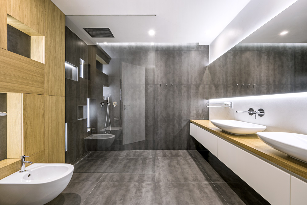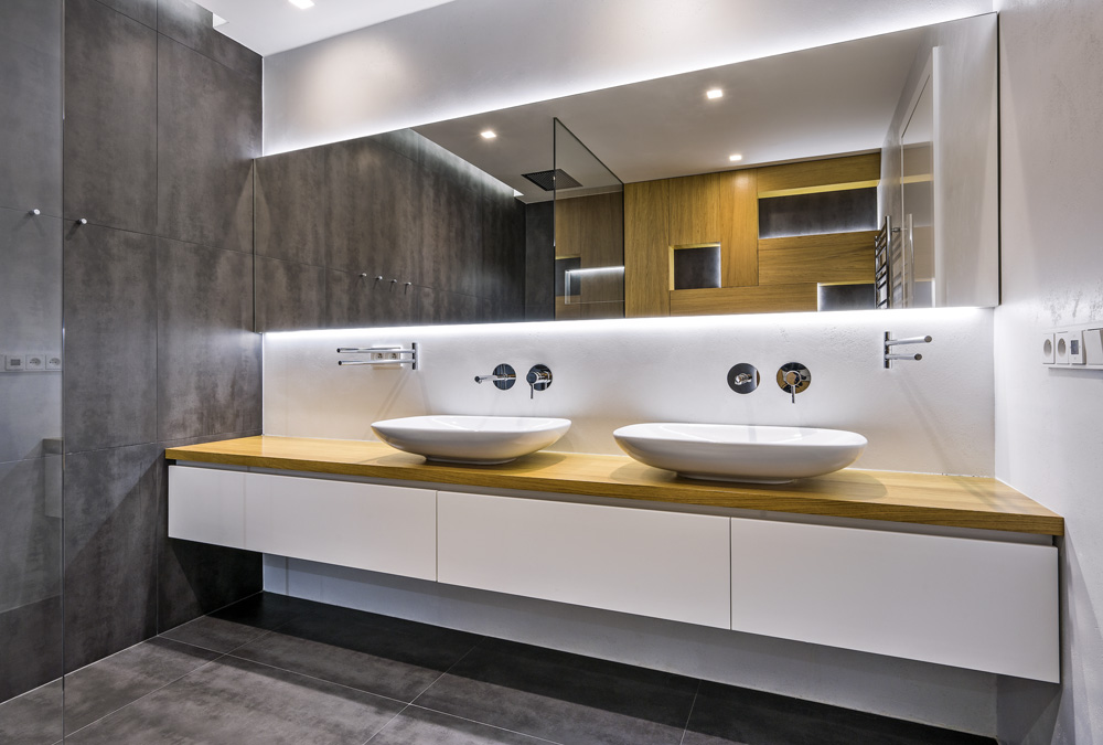 Základní představou majitelů byl velký sprchový kout s dostatkem míst vhodných na odkládání předmětů, dvě umyvadla, klozet s bidetem a dostatek úložných prostor. Protože v koupelně není denní světlo, musel návrhář vymyslet, jak koupelnu dostatečně nasvítit včetně možností měnit různými typy osvětlení v prostoru atmosféru. Kromě klasických bodových světel ve stropě, určených pro celkové osvětlení, tu jsou ještě k dispozici nepřímá světla v několika nikách, nad umyvadly, nad zrcadlem a ve sprchovém koutě. Prostorný sprchový kout tvoří pouze skleněná příčka upevněná v zapuštěných U profilech, takže pohledově nejsou žádné kotvicí prvky viditelné.