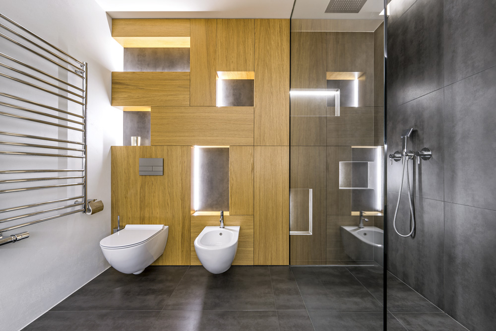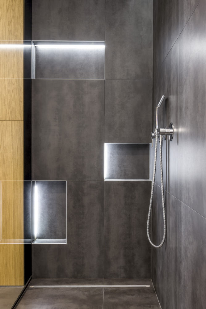Kout je vybavený baterií s ruční sprchou a velkou hlavovou sprchou s několika sprchovacími režimy. Požadavku na dostatečné odkládací prostory vyhověly v koutě tři niky, nasvícené LED pásky. Další osvětlené niky návrhář umístil do velkého nábytkového modulu zhotoveného na zakázku firmou, se kterou studio Perfecto Design dlouhodobě spolupracuje. Ke světlé dubové dýze nábytku tvoří příjemný kontrast šedivé velkoformátové dlaždice s tmavým dekorem. Hra světel, niky a barevné kontrasty dodávají koupelně dynamickou podobu, kterou lze tlumit a měnit různými druhy nasvícení.