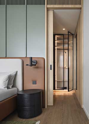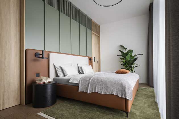 V zadání od klientů architekti obdrželi pouze požadovaný šedozelený odstín, který se měl objevit na kuchyni, a koňakovou kůži, kterou si původně investoři zvolili pro pohovku. „Toto byl z mého pohledu skvělý základ, na kterém bylo možné vybudovat zbývající materiálovou paletu. O celkové koncepci a materialitě designu jsme tolik nediskutovali. Prakticky od začátku jsme byli s investory na stejné vlně. Při první návštěvě na nás byt působil velmi světle a vzdušně. Tento pocit jsme si přáli zachovat až do finále. Proto byla pro doplnění materiality zadané investory zvolena světlá a teplá paleta, kterou jsme se rozhodli aplikovat ve větších plochách, zatímco výraznější odstíny se projevily v doplňcích a akcentech. Klienti se nebáli ani výraznějších textur, proto jsme do návrhu zařadili i deskové teraco na kuchyňské lince,“ vysvětluje architektka.