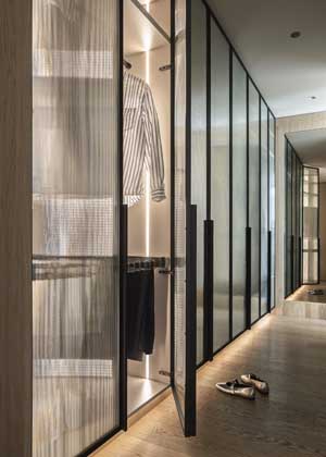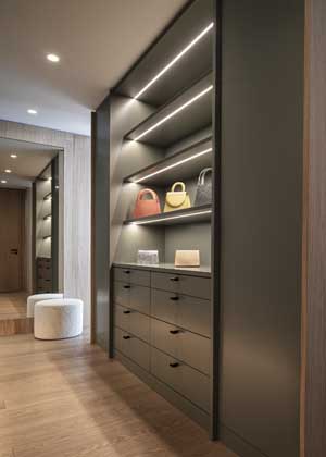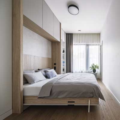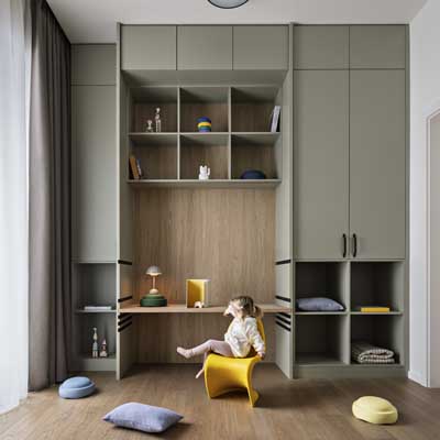 Úložná řešení jsou navržena tak, aby vyhovovala různým potřebám – v šatně udržují pořádek a přehlednost, v hostinském pokoji umožňují flexibilní využití pokoje díky sklápěcí posteli. Vestavná sestava dětského pokoje je univerzální a díky polohovatelnému stolu i nízkým otevřeným policím poslouží dítěti od útlého věku až do školních let.