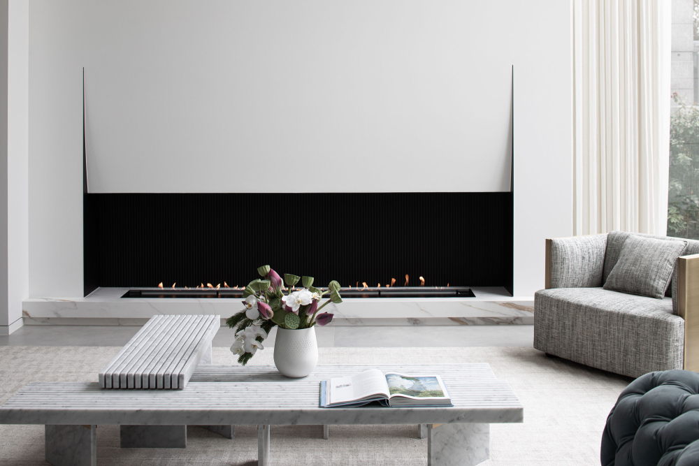 Foto: Hanmo VisualBílé stěny a smetanově laděné podlahy poskytují neutrální základ, který zvýrazňuje odvážné akcenty v podobě nábytku a designových detailů. Lustr s trojrozměrným geometrickým motivem, zavěšený uprostřed prostoru, působí jako umělecké dílo, zatímco minimalistický krb na míru z oceli dokládá filozofii subtilní elegance.