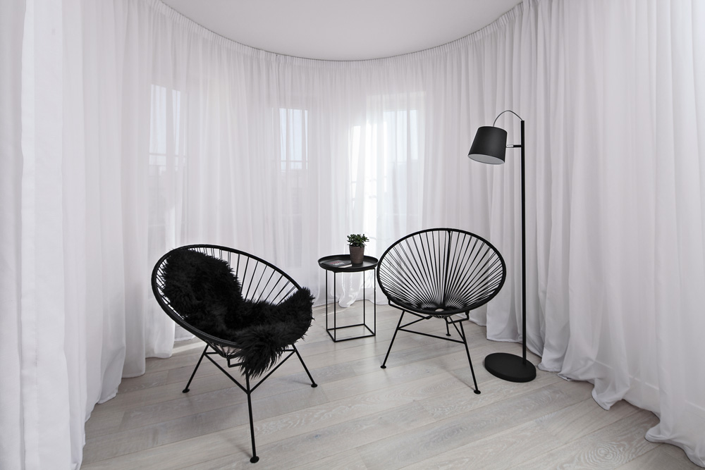 Autorky zde nenavrhly klasický obývací pokoj, ale spíš více míst k různým formám odpočinku. Pohodlné křeslo u knihovny pro čtení knížky a poslouchání gramofonu, dvě křesílka v nice s výhledem do dvora, odkud je možné sledovat i televizor, či velký kuchyňský ostrůvek, který zároveň tvoří i stůl a pojme tak kolem dokola i více osob apod.