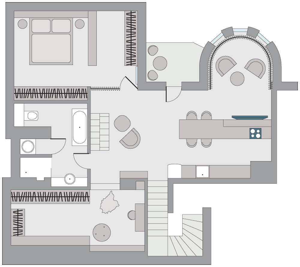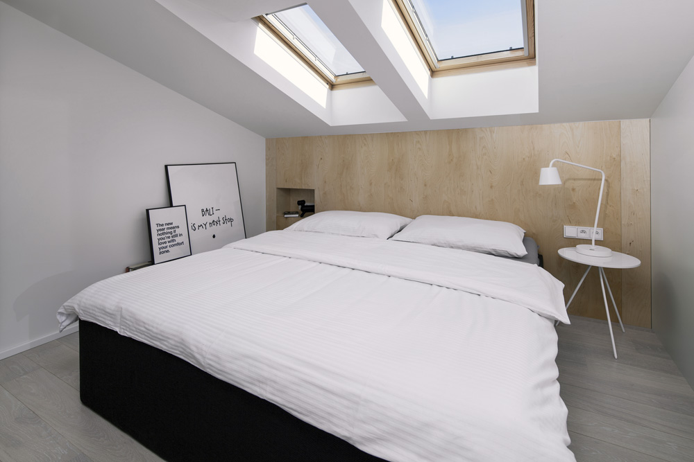 Protože je byt primárně určen jedné osobě, mohly ho maximálně otevřít, aby působil vzdušně. U vstupu je pouze malá chodba s úložným prostorem. Vše se tedy prakticky odehrává v horním patře. Vzhledem k šikminám, stoupačkám či oknům se nedalo s dispozicí zas tak moc hýbat, proto architektky vše pouze „učesaly“ a maximálně vyčistily.