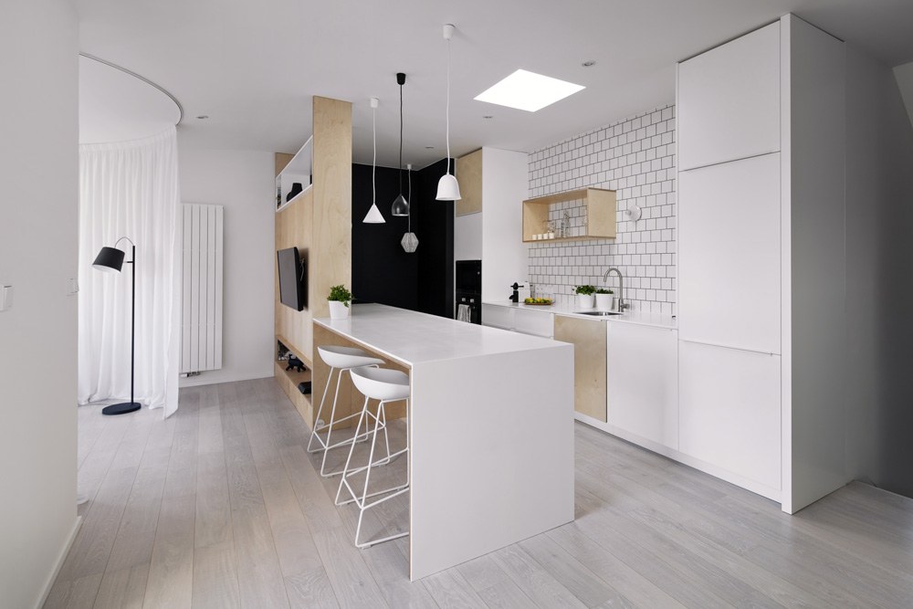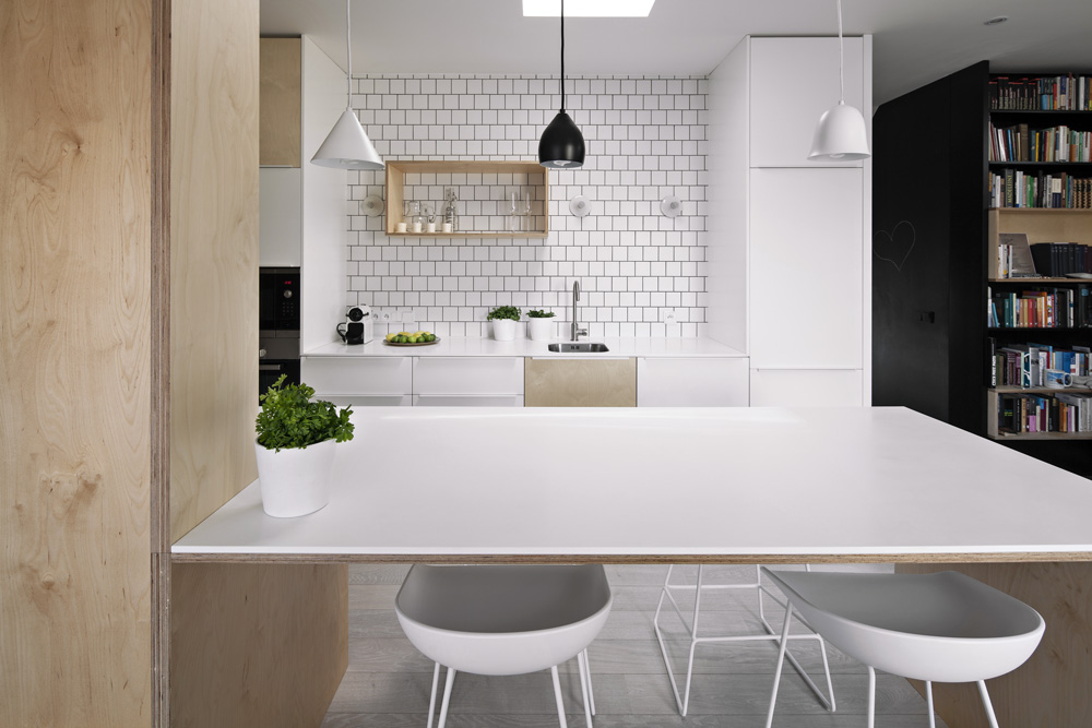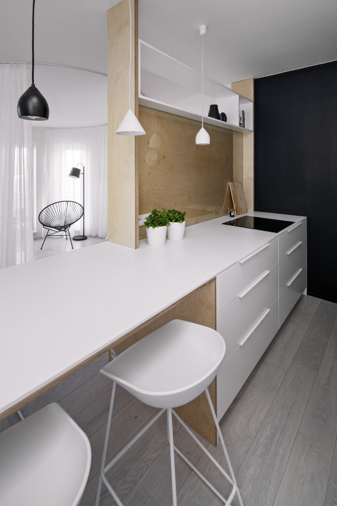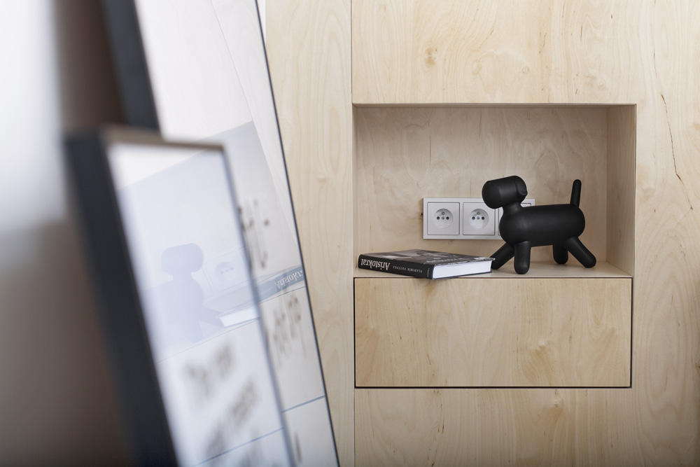K prosvětlení interiéru použily na podlahu bělený dub a prakticky veškerý nábytek pak v kombinaci přírodní překližky a bílého laku. Jedinými tmavými místy v bytě zůstaly černé stěny opatřené tabulovým nátěrem a tmavá koupelna.