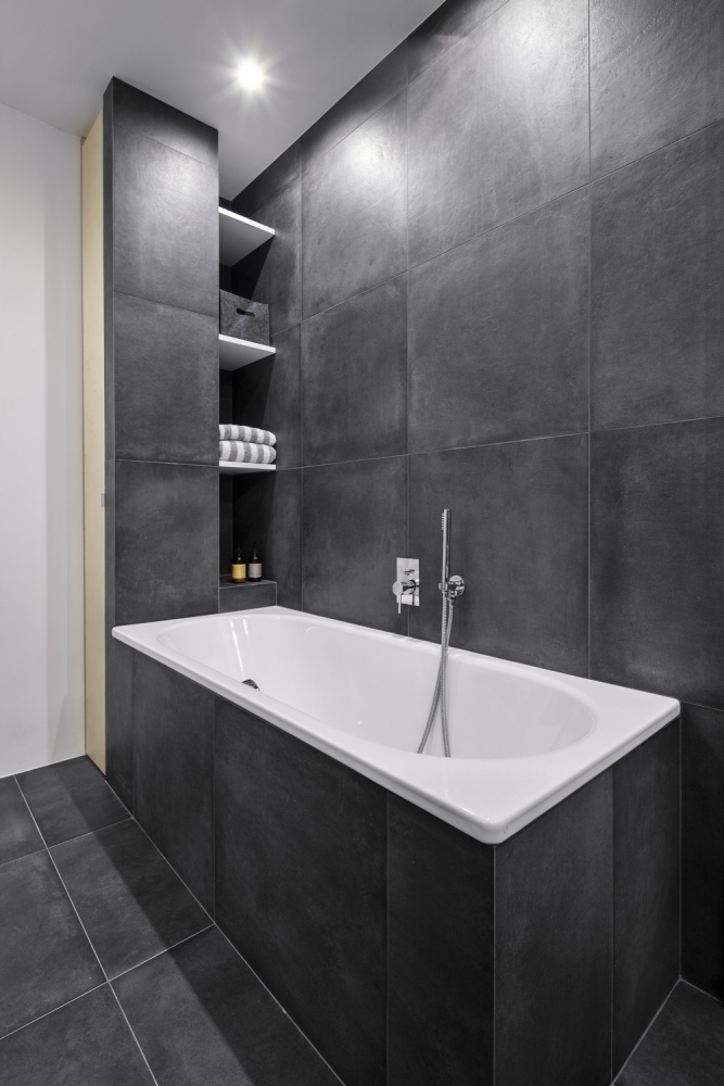 Očekávání mladé ženy byla bezezbytku naplněna. Kladla důraz na úložné prostory a co největší šatnu. To se podařilo. Projevila také přání mít v koupelně vanu. „Za nás je ale nejpraktičtější sprchový kout, takže jsme se snažily umístit sem obojí. Drobný posun příčky to umožnil,“ říká architektka. Majitelka se tak těší z celkového prosvětlení interiéru i velké koupelny, kde nic nechybí.