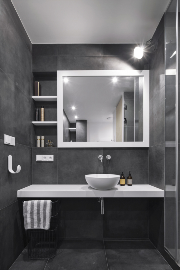 „Osobně mám ráda tyto kontrastní prvky, protože nechají víc vyniknout celkové světlosti. Tmavé řešení koupelny je ale mé oblíbené. Myslím, že je víc relaxační než světlé řešení. A pokud zvolíte správné osvětlení, tak se není čeho bát,“ vysvětluje architektka Klára Valová.