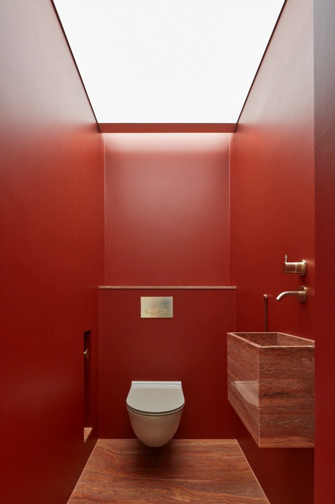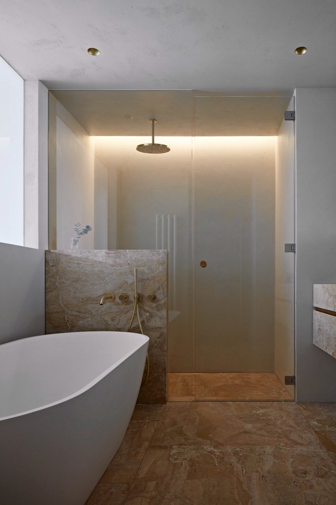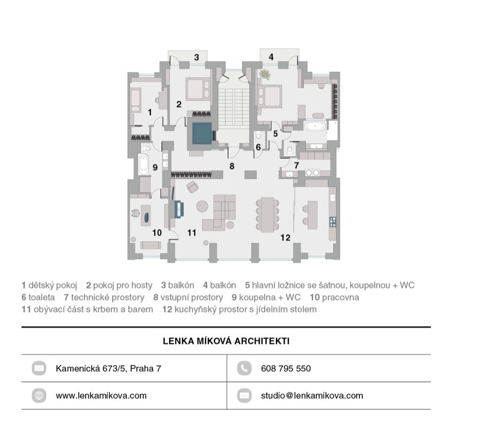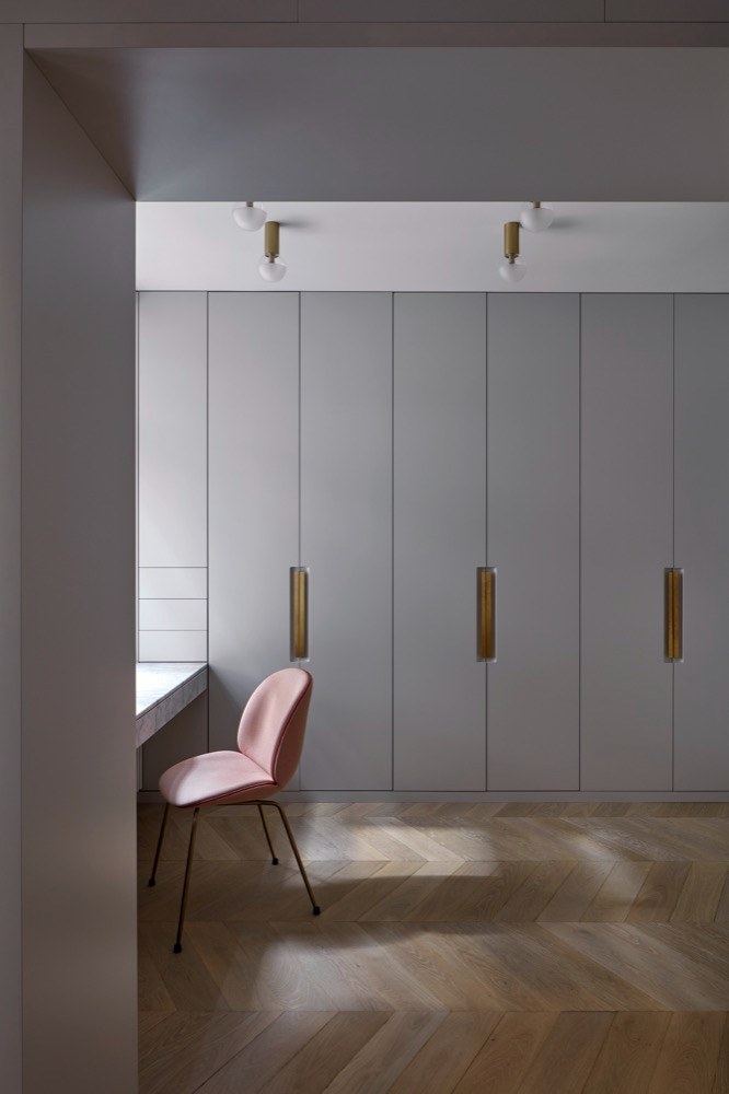 Barva chodby se přelévá i na zadní stěnu pokojů a integruje dveře a skříně. Podobně u hlavní ložnice přechází světle šedá barva z chodby na nábytkové obložení celé ložnice a do otevřené šatny s toaletkou. Pískované prosklení z šatny pouští denní světlo až do hlavní koupelny s jemným béžovým laděním,“ upozorňuje na sofistikovanou práci s barevností a materiály autorka projektu. Právě tato pestrá a odvážná škála, která zároveň nepostrádá v celkovém kontextu jemnost a eleganci, podtrhuje odlišný charakter jednotlivých zón a skrze opakované použití vytváří různé vnitřní vztahy. Pomyslným pojítkem všech obytných místností je pak podlaha z louhovaných masivních parket, na jejíž francouzskou skladbu přesně navazuje i na míru řezaná kamenná dlažba v kuchyni. V interiéru je použito celkem šest druhů kamene – čtyři druhy mramoru, černá žula a červený travertin. Akcenty zde tvoří detaily z mosazi nebo kořenové dýhy. Úložný nábytek, kuchyně, jídelní stůl, umyvadlové sestavy, parapety s kryty na topení nebo odkládací stolky ze zbytků kamenů byly navrženy a vyrobeny na míru.