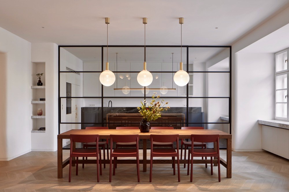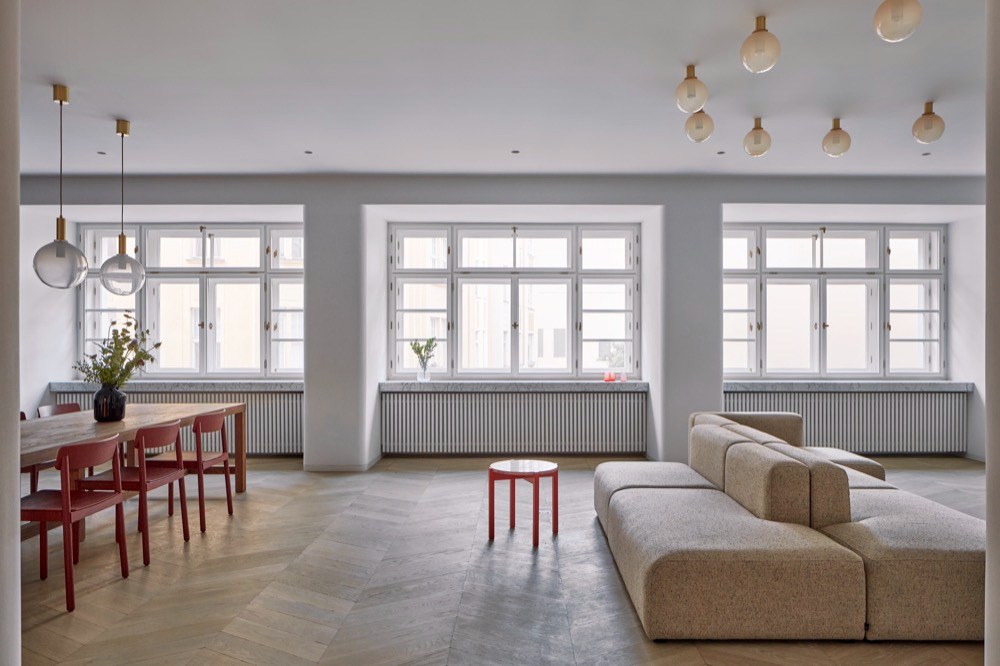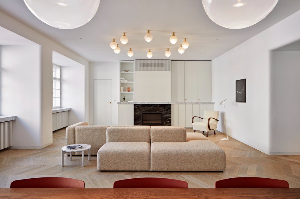 Výrazným prvkem je osvětlení v hlavním obytném prostoru, které vzniklo na zakázku ve spolupráci se studiem Dechem. Jedná se o propojený set svítidel zahrnující deset přisazených koulí nad modulárním sofa, závěsná svítidla nad jídelním stolem, mosaznou trubku nad barem a kruhové nástěnné osvětlení ve vstupní hale. Prvorepublikový byt získal citlivou rekonstrukcí patřičnou noblesu a zároveň potřebnou funkčnost.