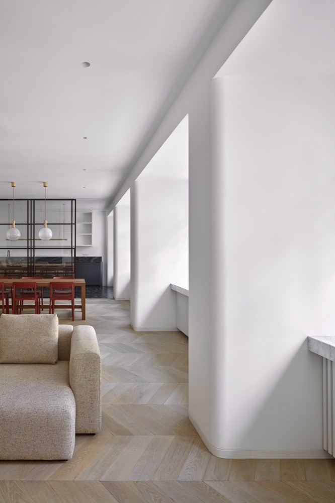 Interiér o rozloze 254 m2 dokonale naplňuje hodnoty funkcionalismu – je pro něj charakteristické využití nadčasových materiálů a množství nábytku i dalších autorských prvků řešených na míru se samozřejmým důrazem na každý detail: „Zadání i náš záměr bylo vytvořit neokázalé a spíše minimalistické současné bydlení, kde zdánlivá jednoduchost v sobě nese určitou vnitřní bohatost a rozmanitost prožitků. Při vstupu tak přivítá čistý obytný prostor zalitý denním světlem, v druhém kroku však interiér nabízí momenty překvapení a objevování – podobně jako v adventním kalendáři člověk předem neví, co se za kterými dveřmi či dvířky ukrývá... Tady se při otevření odhalují odlišné atmosféry – například dýhované vnitřky skříní, mosazný bar nebo celá červená toaleta,“ popisuje architektka Lenka Míková, se kterou na projektu spolupracoval také kolega z ateliéru Martin Surovec. Dispozice je členěna na tři funkční zóny s různou mírou intimity. Hlavní obytný prostor s velkými okny směřovanými do ulice je propojený se vstupní halou a představuje společenskou část bytu určenou k setkávání a dennímu provozu. Na jedné straně je vybaven minimalistickou nábytkovou stěnou s knihovnou, krbem, skrytou televizí a barem, za kterou se nachází pracovna. Na protilehlé straně se nacházejí osmimístný jídelní stůl a kuchyně oddělená skleněnou příčkou s posuvnými dveřmi. „Černá kuchyňská linka tvoří pomyslnou protiváhu ke krbu, zatímco dřevěný bar zase dvojče k jídelnímu stolu. Ložnice jako privátní zóna bytu jsou situované podél zadní fasády do dvora a třetí přechodovou zónu tvoří mezilehlé prostory zázemí, chodby a koupelny, každá s vlastní barevností. Tmavší chodba vede z haly k ložnici pro hosty, dětskému pokoji a sdílené modré koupelně, kam je přístup také skrytými dveřmi ve žluté stěně pracovny.