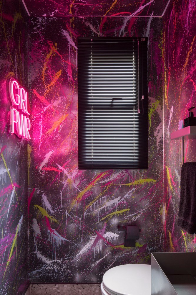 Byt, který kreativnímu projektu poskytl své prostory, byl rozdělen do několika malých místností. Vzhledem k tomu, že podstatou záměru bylo zcela přetvořit stávající uspořádání dispozice, prvním krokem byly rozsáhlé bourací práce. Kuchyň byla propojena s prádelnou do jedné společenské místnosti, do které byla začleněna i jídelní část a rafinovaně připojen také obývací pokoj. Vznikl tak univerzální centrální prostor, který poskytuje komfortní zázemí pro každodenní radosti. Ačkoli se organizaci bytu i jeho zařízení dostalo velmi neobvyklých tvarů, nepřitahuje zbytečnou pozornost. Díky použité striktně neutrální barevné paletě tvoří prostor poměrně střídmé životní kulisy, kterým jasně dominuje bílá v kombinaci se širokým spektrem popelavě šedých odstínů. Šanci vyniknout tak dostaly i přírodní materiály – především kámen, který se reinkarnoval do podoby nepřehlédnutelného kuchyňského ostrůvku. Proměny v barevnosti si nelze nevšimnout v případě obývacího pokoje. Dřevěná podlaha společně s dřevěným obložením stěn dodává místnosti nečekaný akcent a vytváří dojem samostatného objektu s mimořádně útulnou a intimní atmosférou. Zcela nenápadně tak autorky odpočinkovou obývací část postavily do citlivého kontrastu k puristicky jasnému základu. Původní technická místnost dostala v inovátorské koncepci speciální roli. Proměnila se v toaletu, která v minimalistickém celku působí tak trochu jako zjevení – stěny dostaly základní nátěr v kontrastní černé barvě. O jedinečný svrchní design ve stylu akční malby se pak postarala všestranná brazilská umělkyně Jessica Diskin, která neváhala sáhnout po zářivých odstínech růžové i zelené. Úsměvným detailem je na zdi umístěný neonový nápis, který svým růžovým světlem halí nevelkou místnost do příjemně měkkého světla.