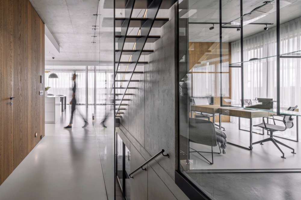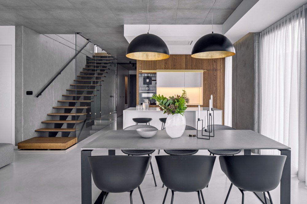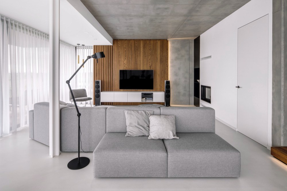 Materiálová skladba hlavního prostoru, stejně jako celého domu drží minimalistický koncept. Kombinuje studené povrchy pohledového betonu, kovu a skla s dřevem v kouřově medovém nádechu, který dodává interiéru teplou složku. „V návrhu a pak i při samotné realizaci při konkrétním výběru jednotlivých kusů vybavení na značky nehledím. Důležité je vyvážení kvality, vzhledu, praktičnosti i sladění s celkem. Vybrané kusy se ale především musejí zamlouvat budoucím uživatelům,“ objasňuje architektka svůj přístup k volbě zařizovacích předmětů.