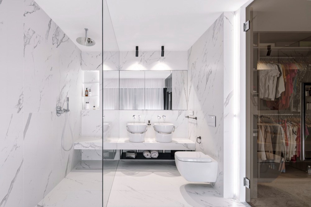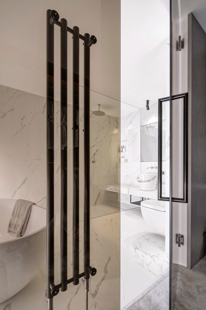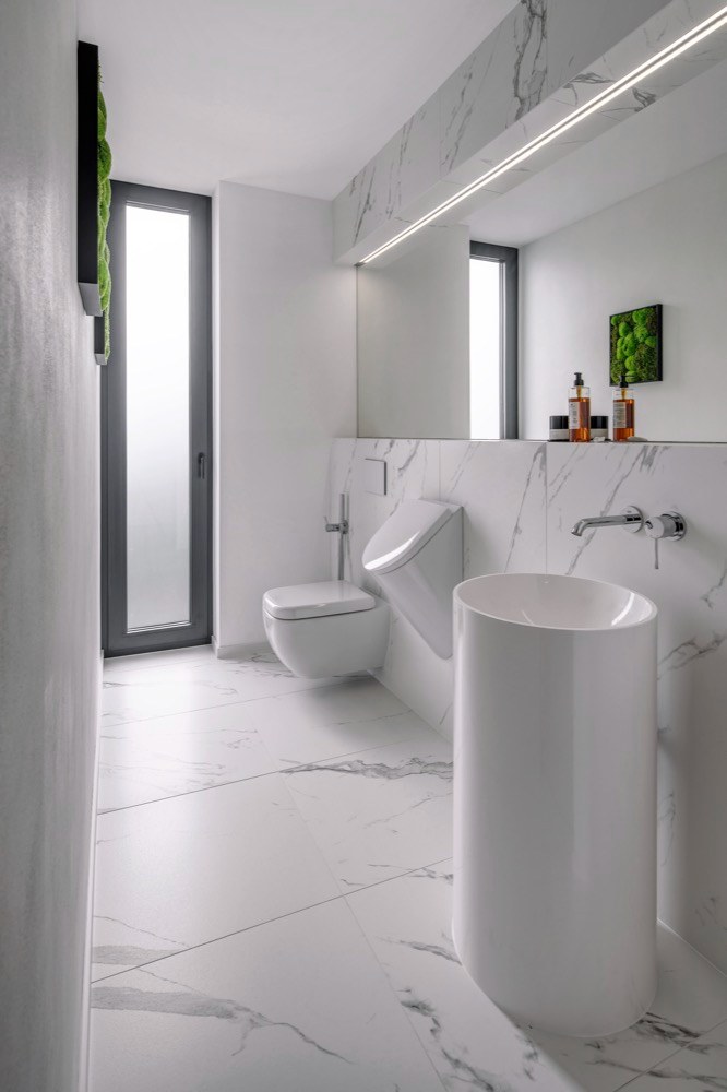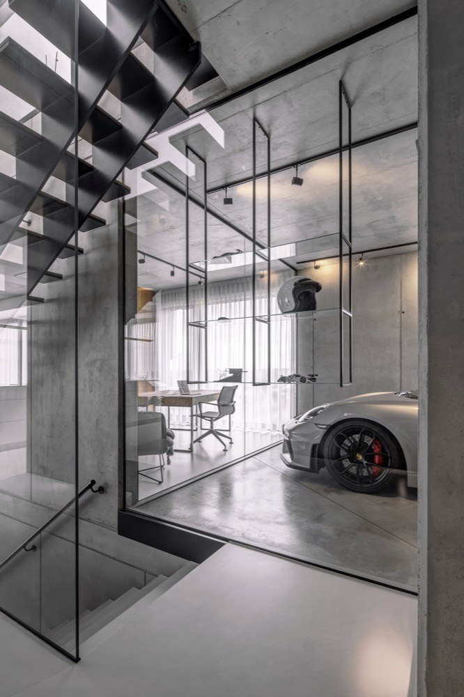 Prostřední, vstupní podlaží obsahuje garáž, která je díky prosklení s pracovnou a komunikační chodbou vnímána jako součást samotného interié-ru. Prosklení garáže bylo jedním z přání majitele domu, který našel zálibu ve sportovních vozech. Průhled skrze tři prostory navozuje wow efekt ihned při vstupu do domu. Příjemně se otevírá všemi směry, a prosvětluje tak i schodiště. Hlavní komunikační chodba na sebe od vstupních dveří váže po jedné své straně linii šatny, toalety a tzv. černou kuchyň, prostor, který je propojen s hlavní kuchyní otvorem v obkladu zadní stěny za pracovní linkou. Jde o sklad potravin a objemnějšího kuchyňského vybavení s rozšířenou možností přípravy díky pracovní ploše a dřezu. Vše špinavé tak může zůstat v hlavním prostoru očím skryté. Stejnou myšlenku drží hlavní kuchyně, kde mají například varná konvice a toustovač speciální boční zásuvku v ostrůvku. Jsou zde pěkně po ruce, ale ne na očích. „Jedním z požadavků majitele domu bylo také použití pisoáru v toaletě prostředního podlaží. I z jiných realizací se mi ukazuje, že pro pánskou část populace jde o vítaný detail,“ dodává Veronika Pánková. Na jižní stranu vystupuje po celé šířce domu terasa, díky níž je v teplých měsících možné hlavní obytný prostor rozšířit.